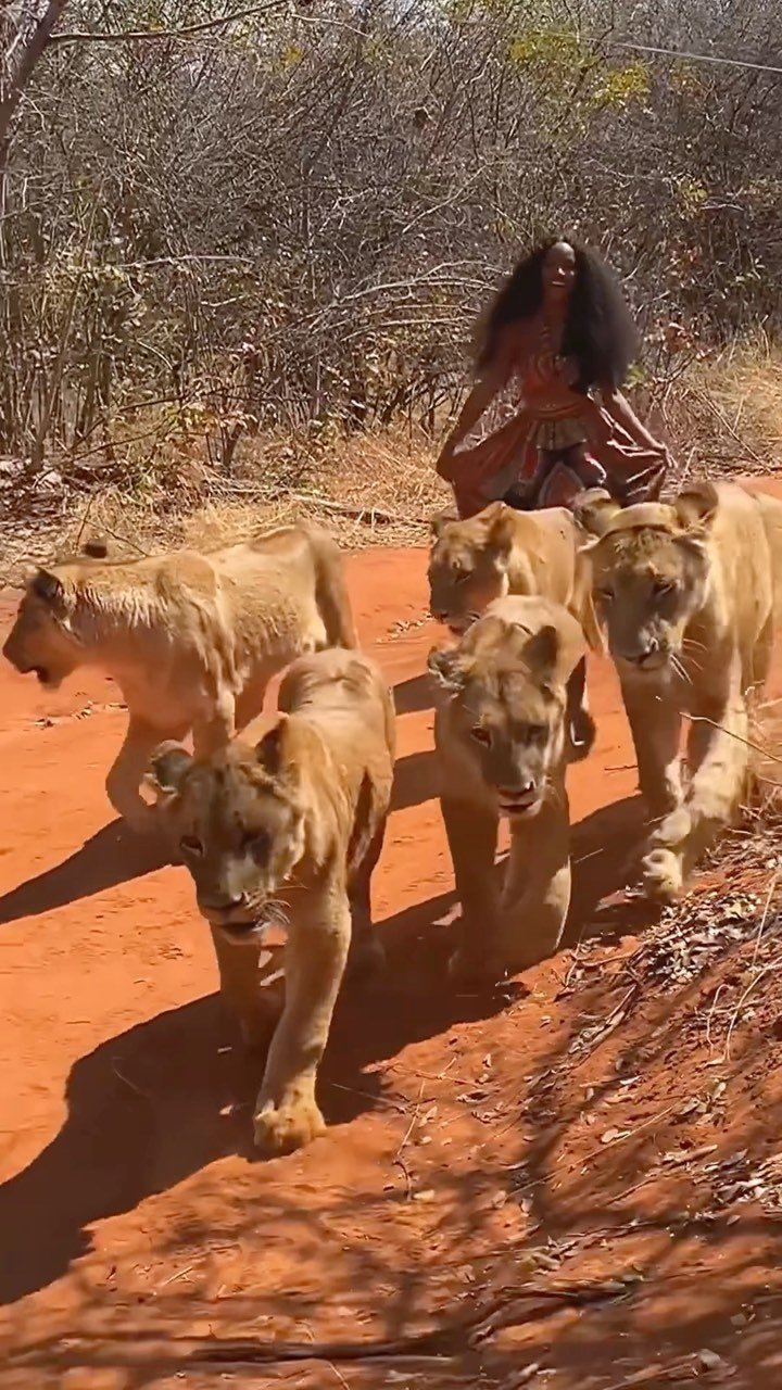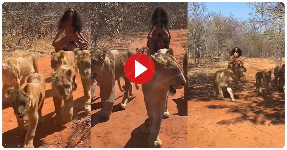 છોકરી 6 સિંહણ સાથે ચાલી